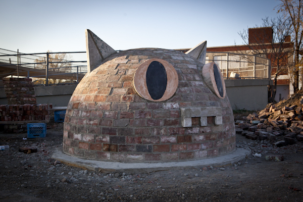 The dome that forms the cat’s head is supported by gravel and an underlying layer of brick. All bricks and the limestone ears were reclaimed, some by Ferretti himself and some from the Imagination Station.