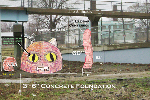 Fueled by Kickstarter funds and nearly 3,000 salvaged bricks, artist Jerome Ferretti has constructed a Monumental Kitty sculpture in North Corktown. Located at the north end of the pedestrian overpass that stretches over I-75 at Cochrane Street, the cat’s head measures nine feet in diameter and stretches more than seven feet tall to the tips of its ears. A twisting tail and paw are yet to be built.