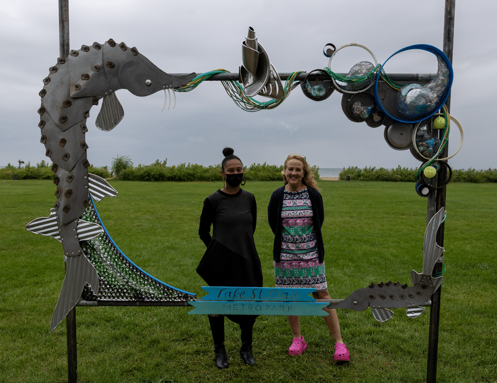The installation at the Harrison Township park is a large outdoor photo frame featuring a representation of a lake sturgeon. It’s constructed mostly out of repurposed would-be waste found in the park and elsewhere in Metro Detroit. The project is the result of a collaboration between the Huron-Clinton Metroparks and Detroit-based artist Halima Afi Cassells. Installation of the piece was completed earlier this month, and it was officially unveiled in an Aug. 19 event.