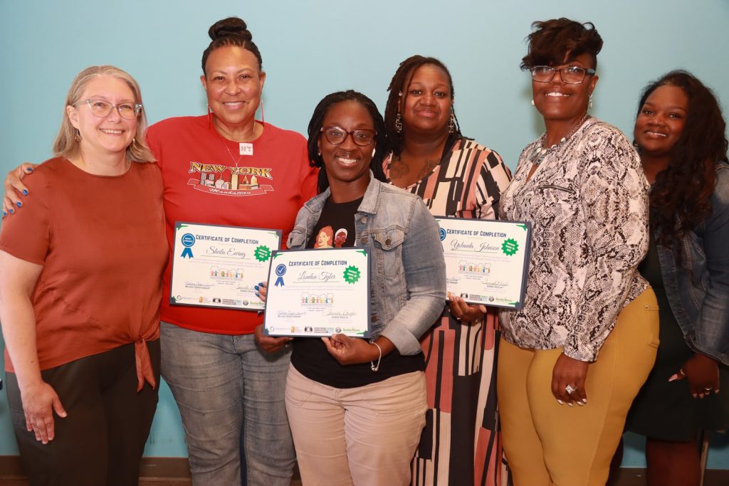 LIFT MI program organizers and participants celebrate participants’ “graduation” from the program. Left to right: Melissa Cooper Sargent, environmental health advocate at the Ecology Center; program graduates Sheila Ewing, London Tyler, and Yolanda Johnson; Samika Douglas, community organizer at Healthy Homes Coalition of West Michigan (HHCWM); and Jameela Maun, HHCWM executive director. Tommy Allen