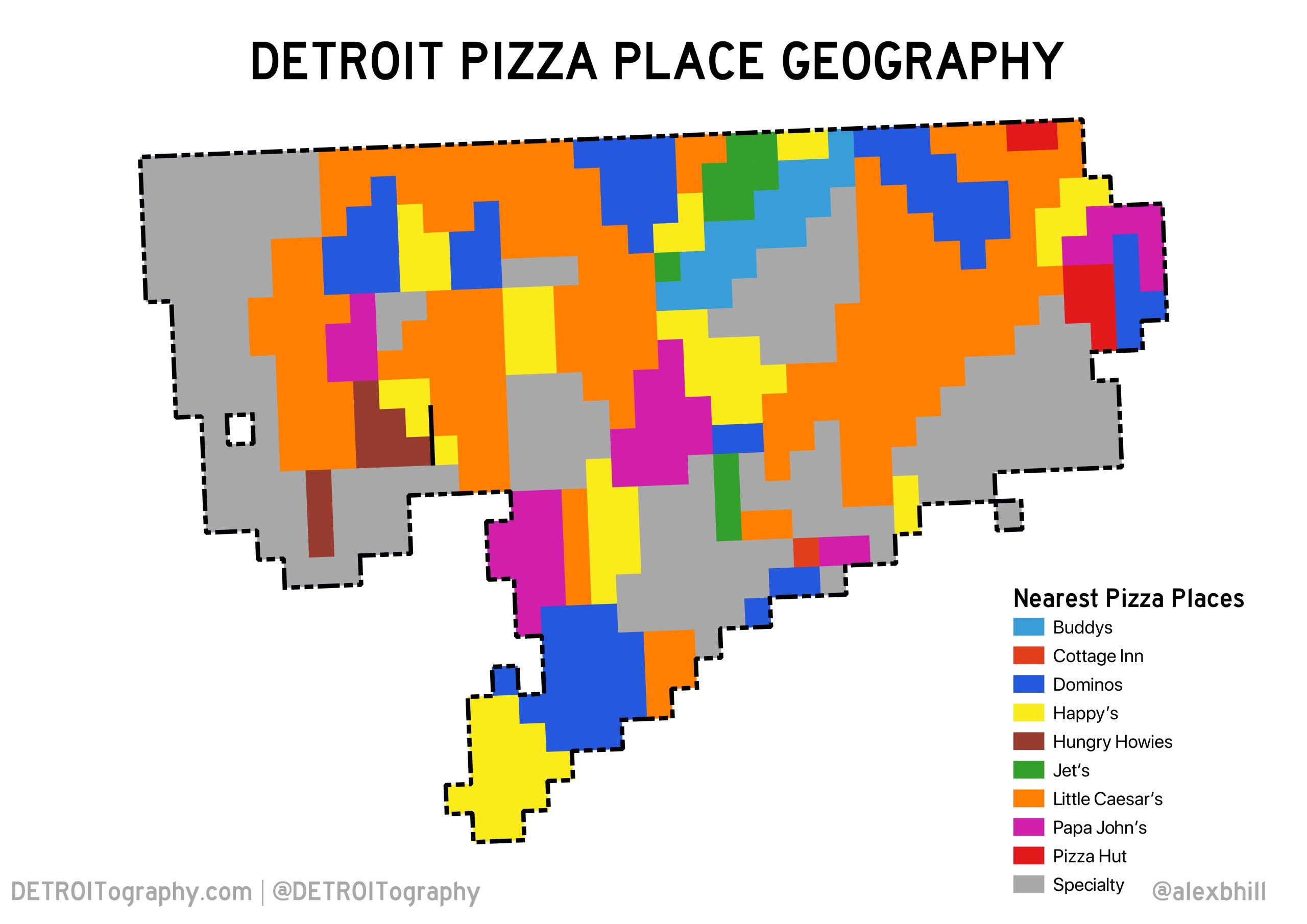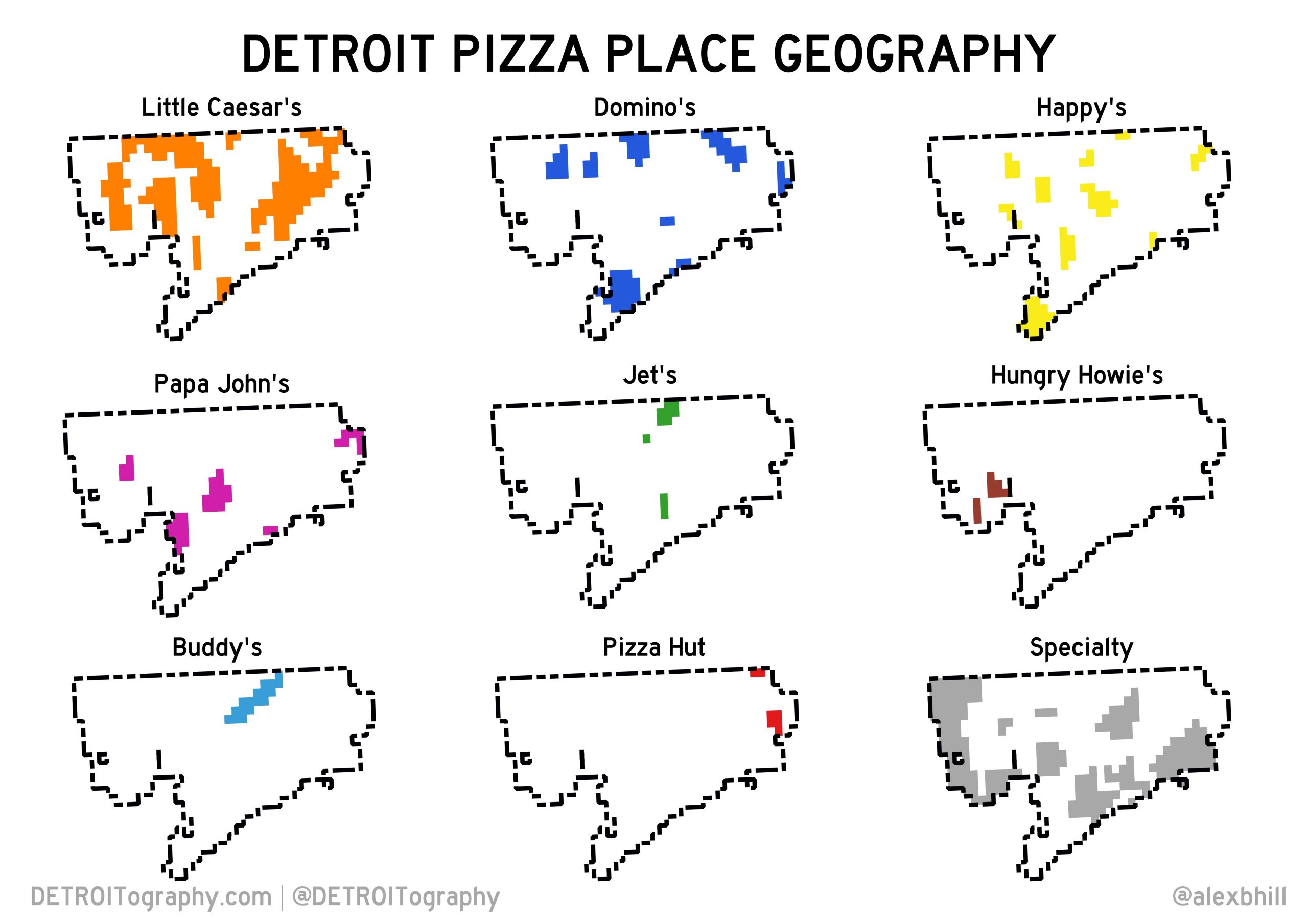 This map is based on which pizza place is nearest to particular areas of the city broken down into a grid (microhoods actually – shout out to Motor City Mapping project). These pizza zones show which chains hold sway over particular areas of the city. Little Caesars is unmatched by any other pizza chain, but specialty pizza places hold their own. When it comes to pizza, Detroit has you covered. You might not find your favorite national chain everywhere, but there’s always a unique pizza option close by.