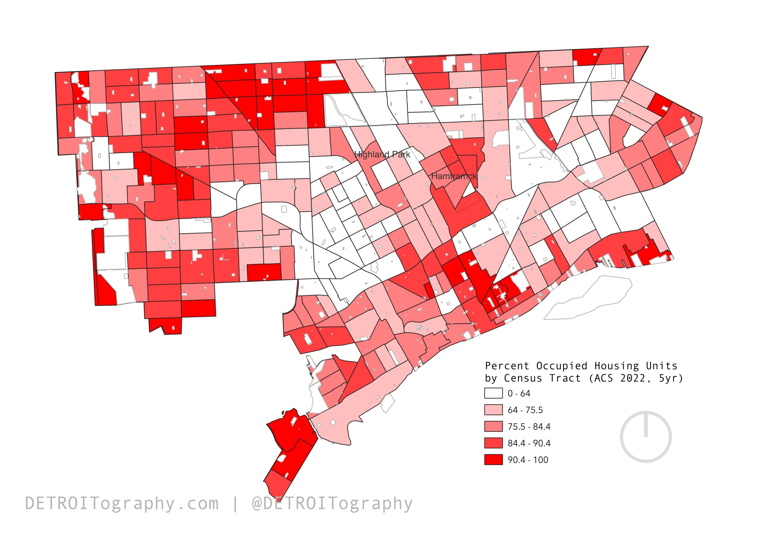 The next best option is Census data on occupied housing units or USPS data on vacancy. I try to opt for the more positive data indicator with where people are in housing. We see a familiar pattern that maps onto the population dense clusters across the city.