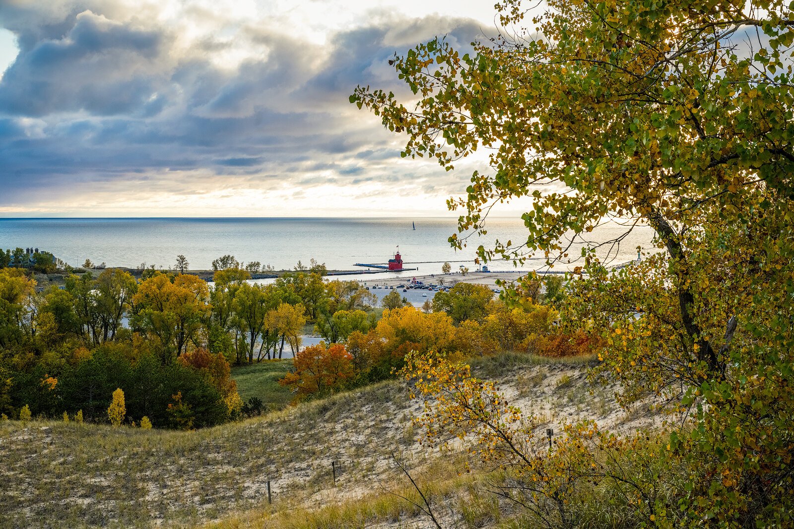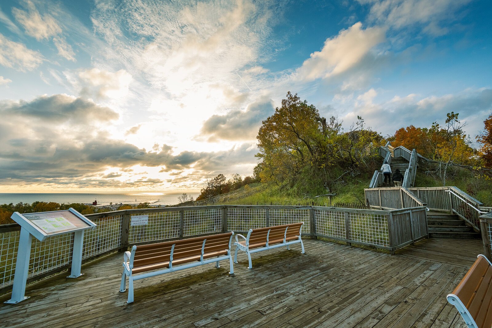 The dune offers commanding views of Lake Michigan, Lake Macatawa, and the Holland Harbor Lighthouse, commonly known as “Big Red.” But Mulligan, current manager and former ranger at the state park, says visitors would frequently scramble up the dune despite the lack of a staircase. That created erosion problems and sometimes resulted in visitors accidentally stumbling into the park’s administration area on the back side of the dune.