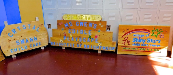 Kyle Baker Jr., Mariah Davis, Lashay Pearson, and Tanay Floyd (all students at Detroit Community High School at the time) decided to transform the garage into a workshop. Bart Eddy, founder and community liaison at Detroit Community Schools, helped guide the youth and establish a formal group, the Brightmoor Woodworkers, which became a student-run business specializing in making hand-carved wooden signs customized to order. Their signs, which can be found at businesses and public spaces around Brightmoor (and now around Detroit), cost about $10 per hand-chiseled letter — and the money goes directly into the pockets of the student workers.