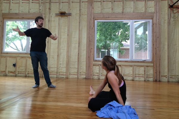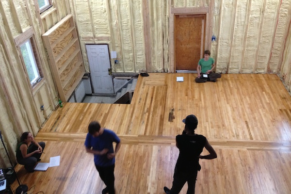Upon entering the approximately 1,000 square foot house today, you immediately notice the soaring, double-height ceiling, which doesn’t seem right for a house its size. Turns out the construction team removed the majority of the second floor, giving the Hinterlands and their collaborators the opportunity to jump, leap, and throw each other into the air without fear of major head injuries. Several first floor interior walls, as well as a closet, kitchen, and bathroom have also been removed to create a wide open, 25′ x 25′ main rehearsal/performance room. Continuing Power House Production’s interest in sustainable technology, the house is heated through radiant floor heating, insulated with spray foam insulation, and all of the original windows have been replaced with double pane, high efficiency windows. Future plans call for the installation of solar panels on the roof and a water catchment system.