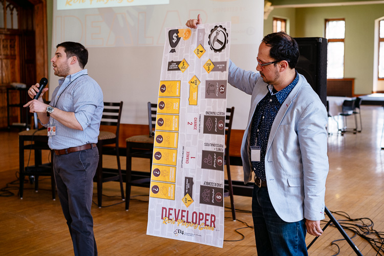 After that, participants engaged in a special board game designed by the nonprofit Doing Development Differently in Metro Detroit (D4) that encouraged them to take on the role of a local developer. Different players worked together in teams to build their own developments, making decisions with investment chips and responding to chance cards to see who could accrue the most profits and community benefits.
