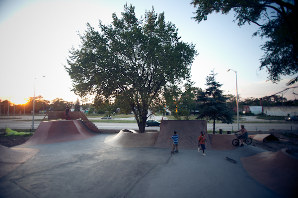 Currently the site, occupying four once-vacant commercial lots purchased from the city, consists of several traditional skate park elements (bowl, quarter pipe, hip, and corner bank), a grill (that’s not skater lingo – you cook on it), some trees, and a lot of dirt. Construction, performed by skate park builders and professional skaters from the West Coast, began in late June. (Check out Curbed Detroit’s construction photo gallery here.) This is Phase 1 of the project, which still requires a little “buttoning up,” as Reichert puts it: some post-construction clean-up and the installation of more fencing and signage.
