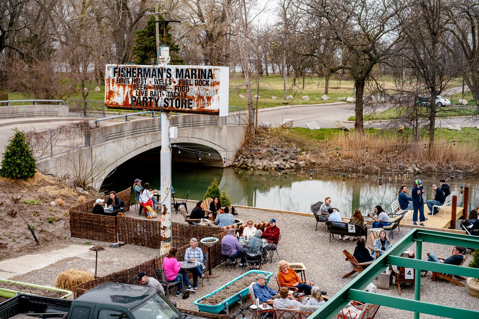 Amongst the fishing boats and kayaks that sit idle and ready behind the homes of Detroit’s canal district in spring, Coriander’s bright blue exterior is a reminder that Detroit summer is in reach. A billboard-like sign for Fisherman’s Marina and Party Store, the last tenant who left the structure more than a decade ago, still stands — emblematic of the fishermen who faithfully gather just across the street at Mariner Park.