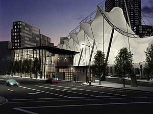 The building foundation work has been completed and 80% of utility work is done. The concrete structure that has risen along Cass is a security tower. “It is a major element,” says project architect Tushar Advani of Parsons Brinkerhoff. “It marks the entrance to the facility.” There will also be an 8-foot wall that surrounds the entire 2.4-acre site.