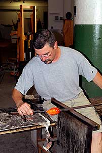 When Young is blowing glass—an art form he’s been honing for more than 25 years—it’s like watching a conductor with his symphony. After gathering molten-orange glass from one of the three furnaces, it’s an act of improvisation: sitting and rolling at the bench, standing and blowing, trapping his breath in the pipe, using jacks, diamond sheers and pinzas for necking, trimming and handling. His movements are as fluid and beautiful as the glass he’s shaping.