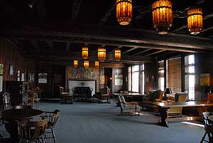 The lounge also features the Scarab family tree mural, designed and executed in 1928 by artist Paul Honore, which pays tribute to drama, music, literature, printing, graphic arts and architecture. Metal and mica art deco chandeliers, designed by Scarab Club member Victor Toothaker, straddle the famous beams, and member-crafted photographs, paintings and collages line the walls. Just off the lounge is the Historic Room — formerly the dining room — which is used mainly for administrative functions. The room is worth a glance if only for its pendant lamps, whose metal rims feature cutout designs depicting a fish-baiting hook, a bear and a beehive, a harried waiter, and other scenes relating to the service of members’ meals.