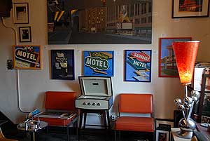 Artists are also given carte blanche to decorate the spaces. SLAW, who shares his studio with photographer VATO, created a “quasi-retro living room” on the lower level, with a 1930’s cigarette machine, modular chairs and couches in orange, mustard and black, and atomic age chrome lamps. A cocktail shaker and bartending accoutrements crown the tiled bar, which anyone can sign provided they are nude (according to the edict posted on an adjacent wall), and a Pepsi machine from the club’s earlier days sits in a corner, chilling beer.