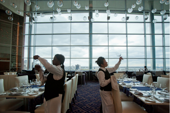 Across town, chef Don Yamauchi‘s crew is gearing up for evening service at Iridescence. In a few short hours, the dramatic space will be transformed, with dim lights, the gentle tinkling of silver, and well-dressed patrons overlooking the panoramic cityscape below. But for now, it’s the calm before the storm; servers circulate the large, light-filled room polishing glassware and making sure everything is in its right place.