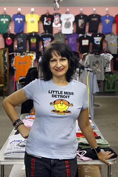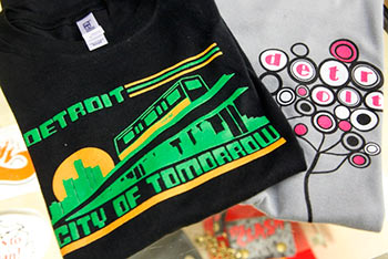 Designs range from the whimsical Little Miss Detroit t-shirts (a take-off of the Little Miss book characters of the 1970s) to shirts that look like bathed-in-grit homages to Detroit’s working class heroes.