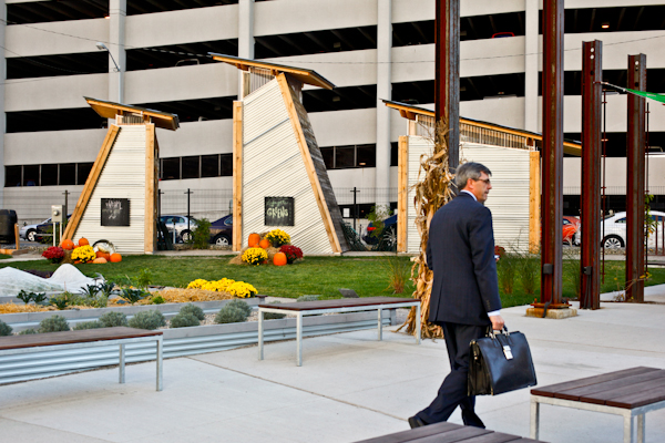 About six blocks away from Colors, Detroit’s newest and most visible garden sprang forth on the rubble of the Lafayette building. I had long admired the hieroglyphic inspired graffiti on the Lafayette building, as well as the large cotton wood saplings sprouting from it’s roof. I was saddened to see it demolished, and skeptical to hear that it was being replaced by a garden sponsored by Compuware.
