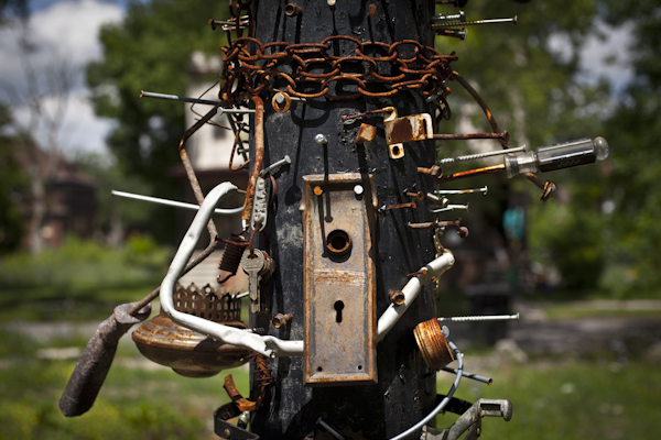 The major focal point of Sean’s art work is an African inspired N’Kisi, a log similar to a totem pole covered in all kinds of rusty nails, screws, lost keys, pitch forks and other bits of metal. Sean explains the meaning of the N’Kisi this way: “I’m not a superstitious man, but I like art. It keeps evil away from your community.” Many of the items embedded in the the N’Kisi are collected from Sean’s “scavenger hunts” around the neighborhood — from sidewalks, vacant lots, and recently demoed buildings. Utilizing these artifacts in art works is a way of paying tribute to the legacy of those that have lived in this neighborhood. “Folks think you gotta have a canvas, a bunch of brushes, tubes of expensive paint and all that stuff to create art,” Sean says. “You can walk around the city and find a thousand things to create art work.”