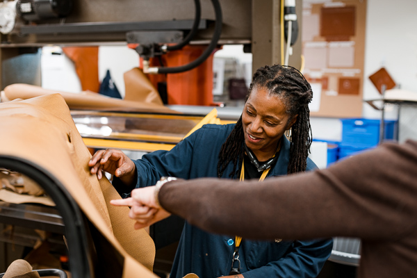 A Shinola worker assembles a leather hand bag