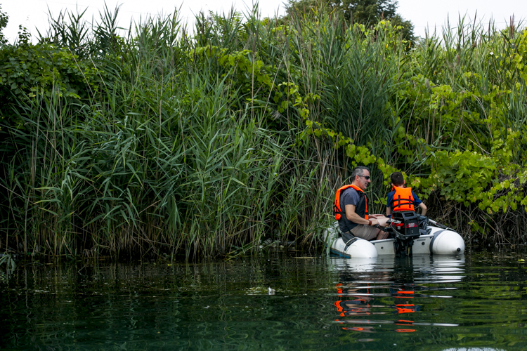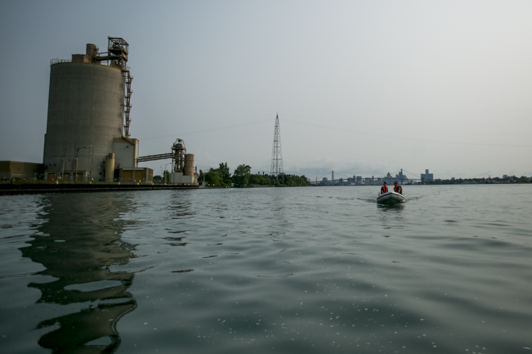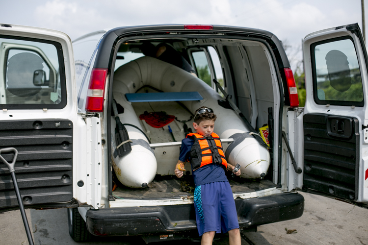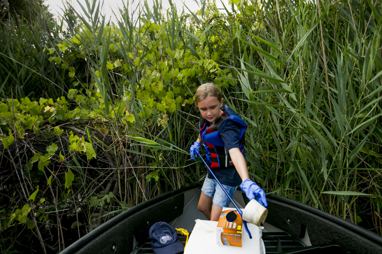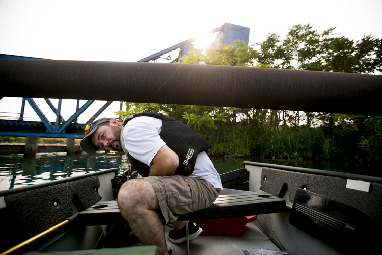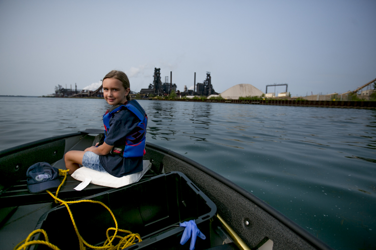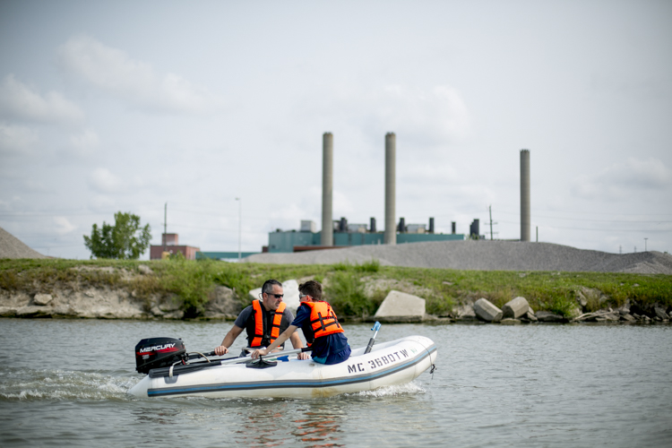 Charlie Spiess brought his 7-year-old daughter, Jessica, on his second weekend of trash fishing. It was only Spiess’ second time driving a boat. They traveled around in a foldable Port-A-Boat Spiess got for free from a friend. Jessica sat perched on the bow wielding a pair of grabbers while Charlie navigated through the murky waters. Maneuvering into eddies and reed-covered shores, they slowly collected water bottles, styrofoam bait boxes, and the plethora of flotsam lining the canals around Zug Island.