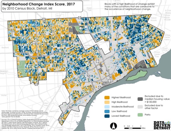 Data Driven Detroit just released Turning the Corner, originally an attempt to develop a predictive model for resident displacement. The final result, however, is possibly more interesting and useful.