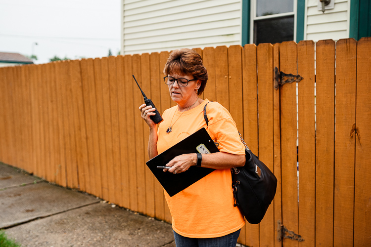 Barb checks in with Gary Cook, their base operator and another neighborhood volunteer, on the radio before getting in their car. While on patrol, they check in with Cook every 15 to 20 minutes.