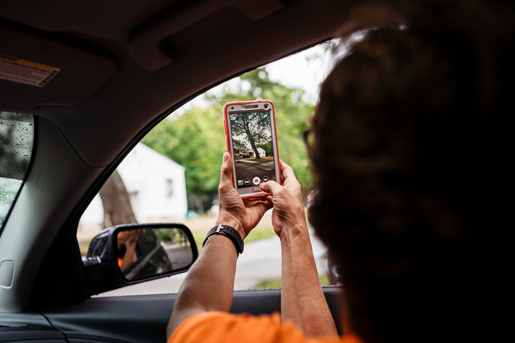 Barb photographs a leaning tree to upload to Improve Detroit. She suspects that some heavy machinery bumped into it during a house demolition. It’s tall enough to damage the house across the street if it falls over.