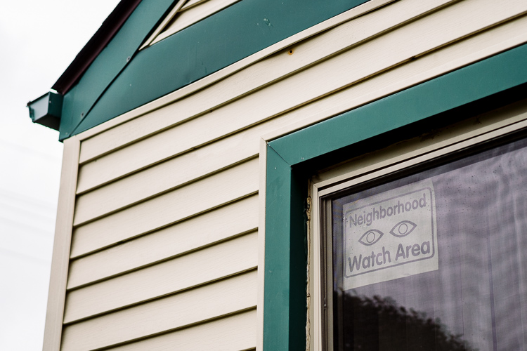 A neighborhood watch sign in one of Barb and Joe’s home windows.