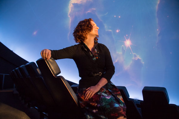 Auchtung’s job responsibilities vary, depending on the day. A couple of days a week, she presents shows to the public or school groups at the planetarium. On other days, she programs new shows and content, fixes equipment, and works on other administrative tasks that keep the planetarium operating effectively.