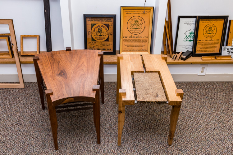 A joint effort of Recycle Ann Arbor and the Southeast Michigan Resource Conservation and Development Council, the Urbanwood Project started in 2005 to boost recycling of dead urban trees. Thanks to the emerald ash borer, which hit Michigan particularly hard and decimated millions of ash trees in southeast Michigan alone, there was an abundance of wood to work with.