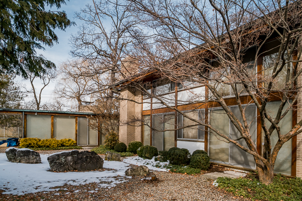 It’s impossible to fully appreciate its beauty from the street. Perhaps the most interesting feature is its integration of the indoors and outdoors. A courtyard with a pond sits in a covered walkway between sections of the home. Large windows and skylights admit ample light. The grounds also contain a rock garden and lot-sized yard.