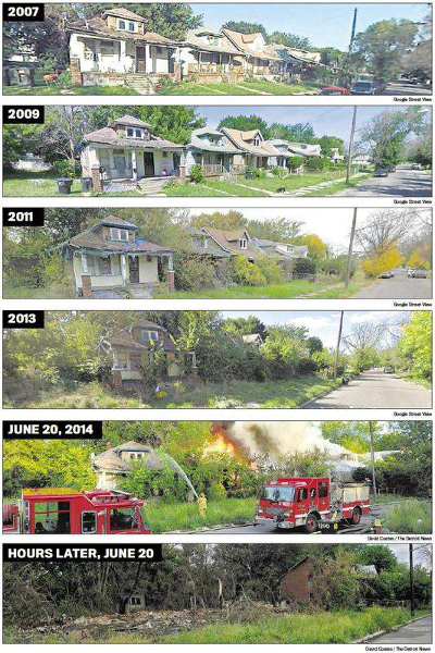 GooBing is the act of comparing images of the same location with Google Street View and Bing Maps. When GooBing Detroit first hit the Internet, most Google Street View images were taken c. 2009, while most Bing Maps images were taken c. 2012. When presented side-by-side, the images reveal the (often dramatic) transformations experienced by Detroit locations over three short years. Thanks to the release of historical Google Street View, GooBing Detroit now can document transformation in Detroit in greater detail. Many posts showcase the decline of individual properties, while (in rarer instances) others highlight rehabilitation.