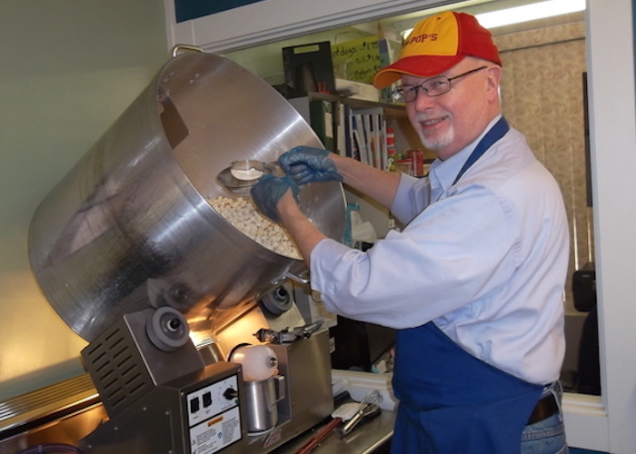With an expensive oil-popping machine out of reach, a $20 hot-air popper was the couple’s first investment. Next, they invested hours of research and experimentation into ingredients and methods of coating air-popped popcorn. The name of the business came from a moniker that Gene’s children called his dad, “Pop-Pop.” Now, Gene’s grandchildren call him, “Pop-Pop.”