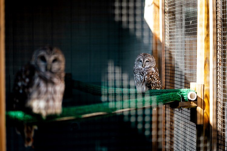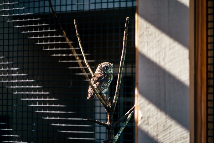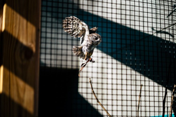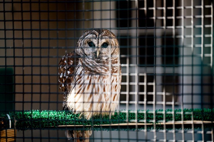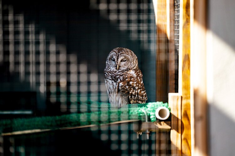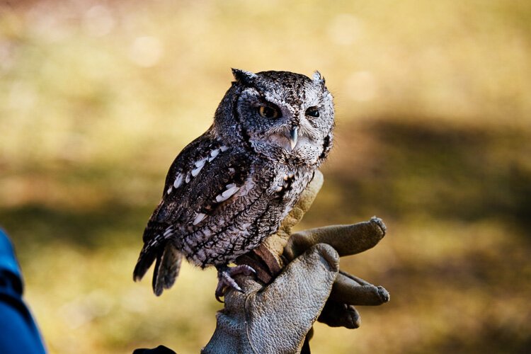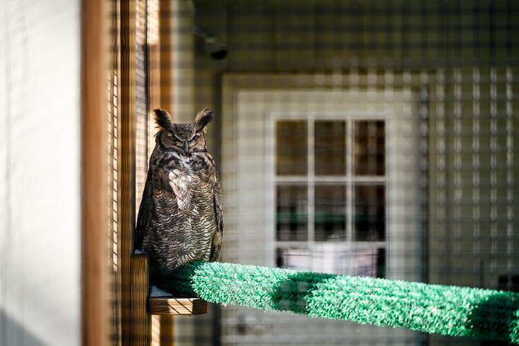 If observing owls in nature, Funk says stress indicators from the bird may include constant blinking or focused staring. Owls with feather tufts atop their heads, such as the Screech, Long-eared, and Great horned owls, will stick those up when they feel threatened in order to make themselves look more prominent or stretch their body to help them blend in. She says if you notice these behaviors, it’s a good sign the owl is uncomfortable, and it’s time to back away.