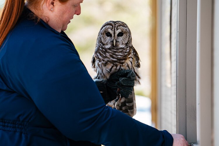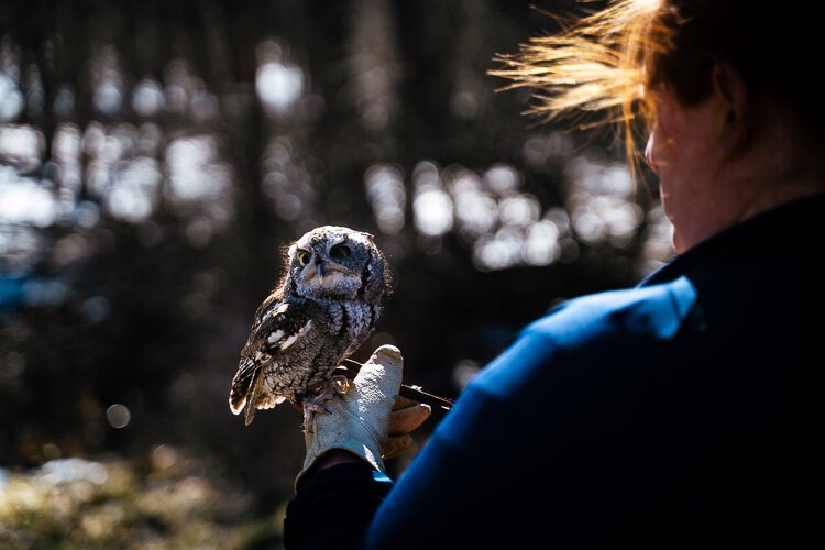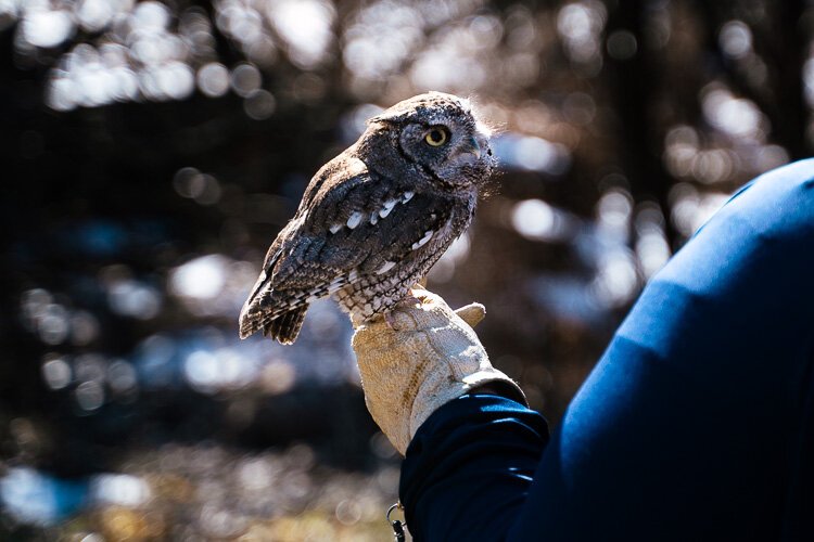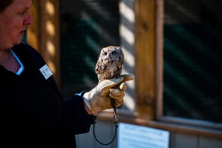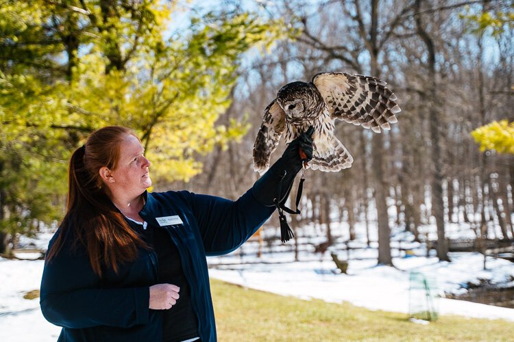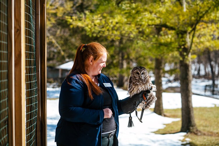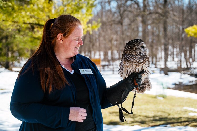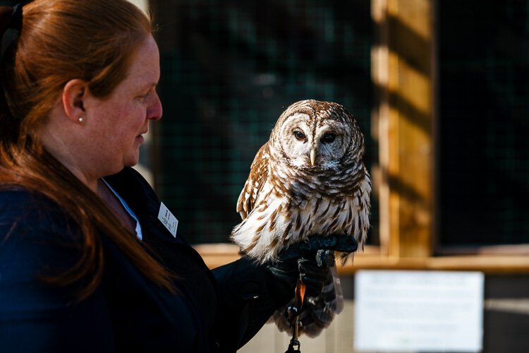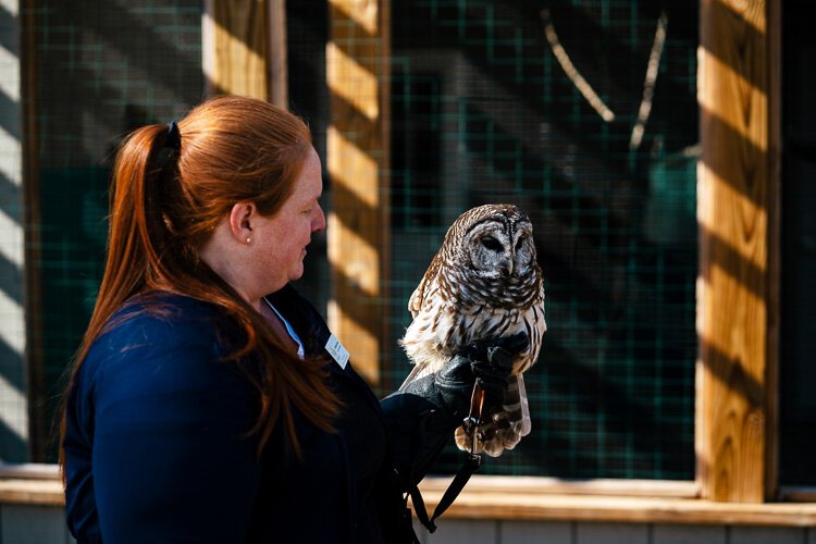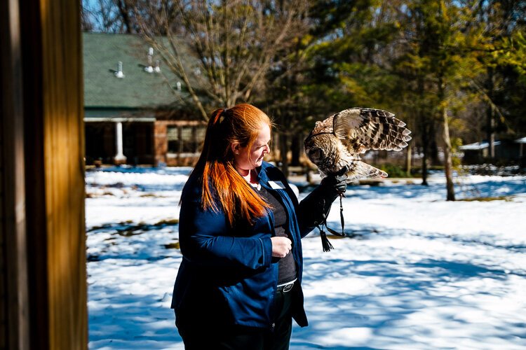 Christina Funk holds Sam on her hand outside. Funk is the Assistant Naturalist and owl handler at the Stage Nature Center.