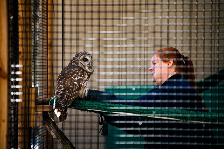 “I enjoy working with an animal and watching their behaviors that humans are not interacting with as much because they’re an animal most active when we’re sleeping,” she says. She tells about Autumn, who, from her outdoor captivity, interacts with a pair of wild Great horned owls who live in the center’s woods. They land near her enclosure and talk back and forth with her, particularly during mating season. When their juvenile started flying, it began visiting also.