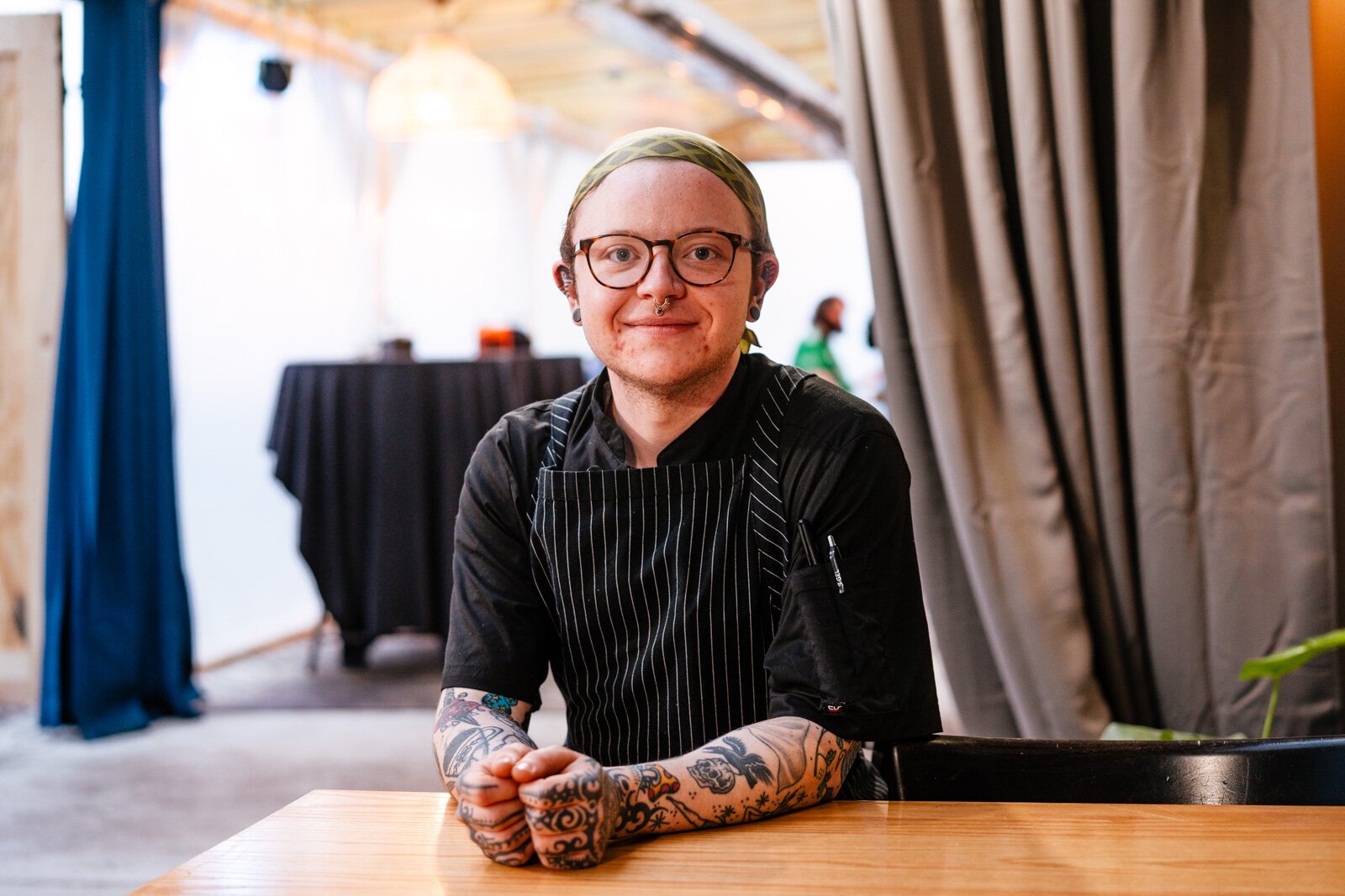From left, Chef Omar Anani and Artemis McGettigan, who leads the restaurant's efforts with The PLEDGE, pose at a table in Saffron De Twah.