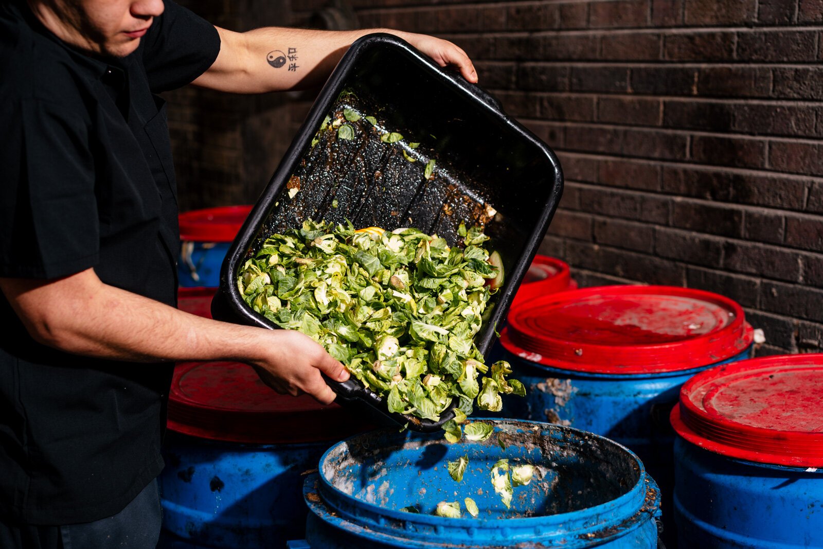 Nick Hagen – A staff member pours unused brussel sprout leaves into a compost barrel at the Apparatus Room.