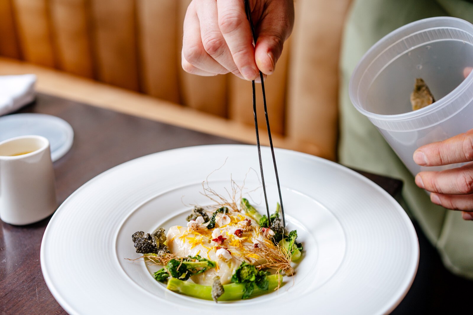 Nick Hagen – Ken Miller places cooked wild garlic roots to a roast sablefish dish.