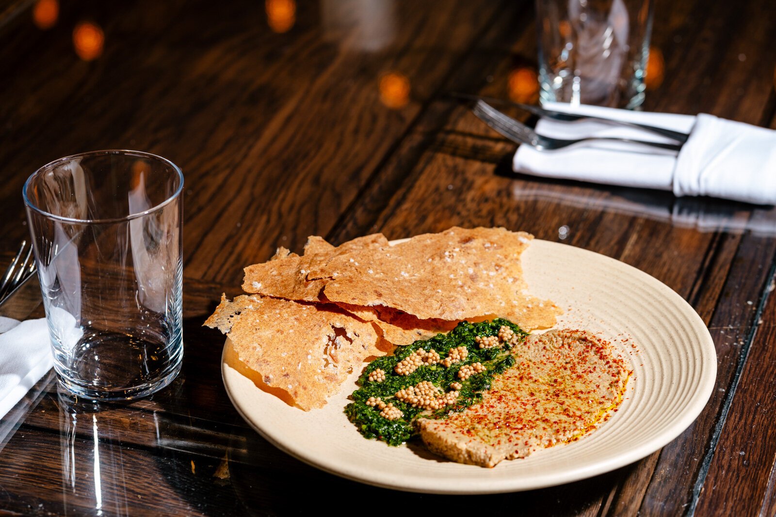 The chefs’ contemporary American cuisine includes offerings like broth made from the smoked bones of the sablefish and a dish crafted specifically to enliven potentially wasted ingredients: baba ganoush, a foraged garlic mustard pesto, and crackers made from spent bread.