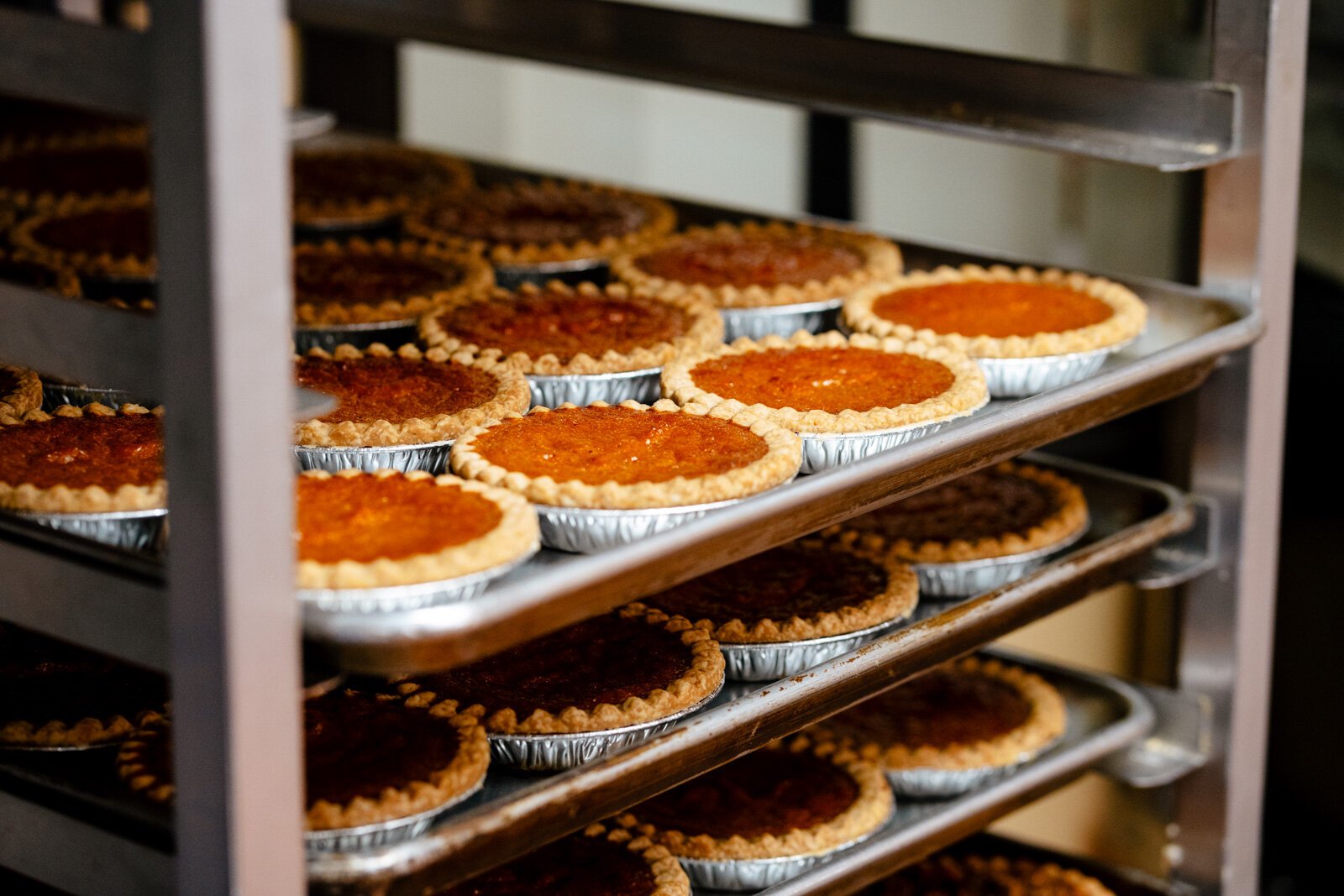 Nick Hagen – Racks of sweet potato pies in the kitchen.
