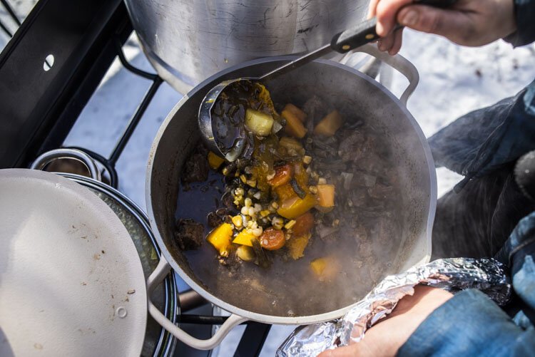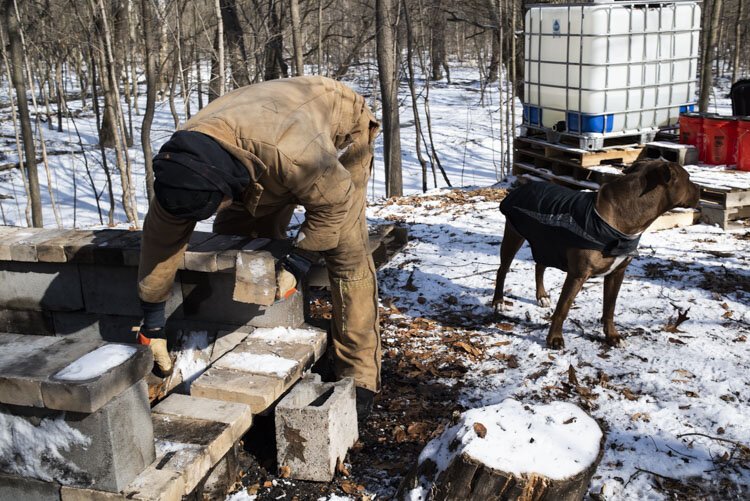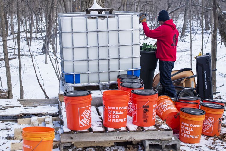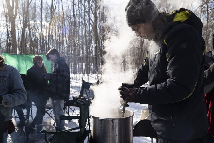 A ceremonial bonfire gathers the community. Traditionally, pots sit over a large fire that is usually kept burning for several days, and as the sap boils down, it needs to be constantly watched and stirred. It takes approximately 40 gallons of sap to make 1 gallon of maple syrup, and can be stopped from boiling over with cedar or balsam branches.