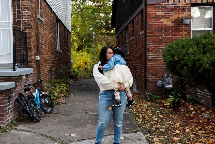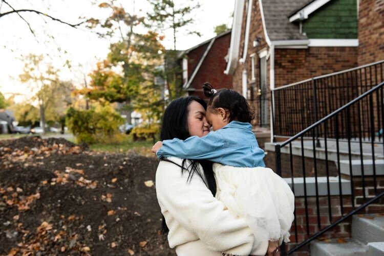 Lauren burrows her head into her mother’s chest. She’s timid, Cruz says. The two spend every day at home together while her husband works. The couple has one car, and she has yet to learn to drive in Michigan, something she hopes to do soon. As her daughter’s first teacher, she helps her practice her colors, numbers, letters, and vowels. Lauren draws and paints on a tablet and “cooks” in her play kitchen. Together, they watch videos online to help them learn English.