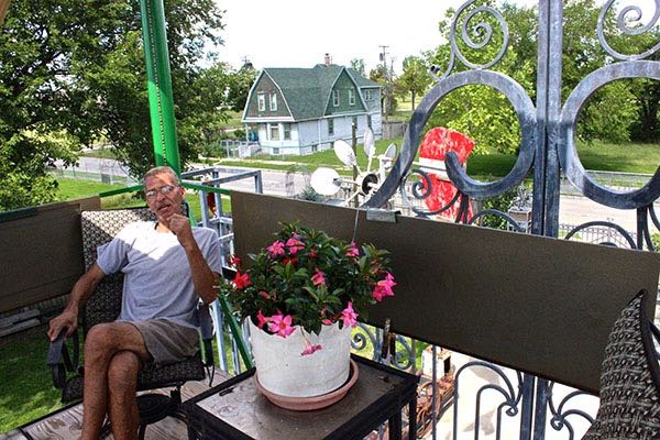 That history includes Nielbock’s own fascinating story, which he tells from his comfortable perch in a deck chair on the middle tier of a 36-foot “sky garden”—a three-story sort of industrialized Hanging Garden of Babylon, bedecked with potted plants and supported by four salvaged Detroit light poles.