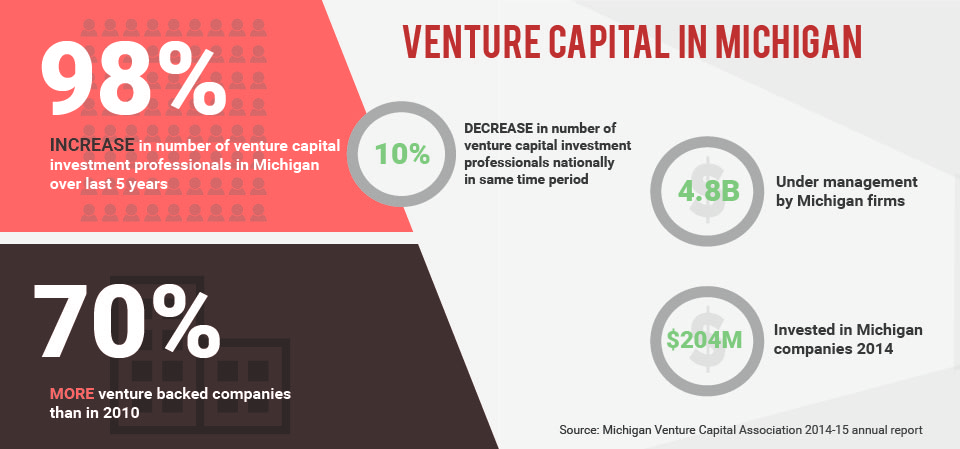 According to the Michigan Venture Capital Association’s 2014-15 annual report, the number of venture capital firms based in Michigan has increased 48 percent in the last five years. There are currently 129 venture-backed companies in Michigan, 70 percent more than in 2010. A full 65 percent of all venture capital invested in Michigan companies last year came from venture firms based outside of Michigan. In many cases those firms were brought in by Michigan venture firms.