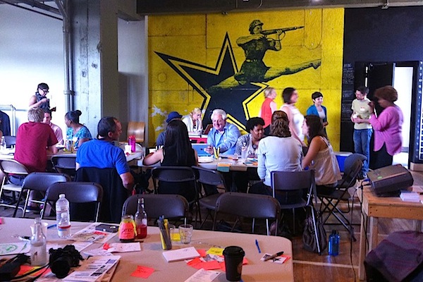 As Megan Deal of Little Things Lab told me later, the purpose of this workshop was not only to understand our own capacity for imagining. The city of Detroit has no shortage of fresh ideas. The challenge for her team was to help us move from coming up with something joyful to actually getting that off the ground in one way or another. Towards the end of day one, each of the five groups were pushed to make their ideas come to life in one tiny productive way. How would we make that happen? The mood was frenetic.